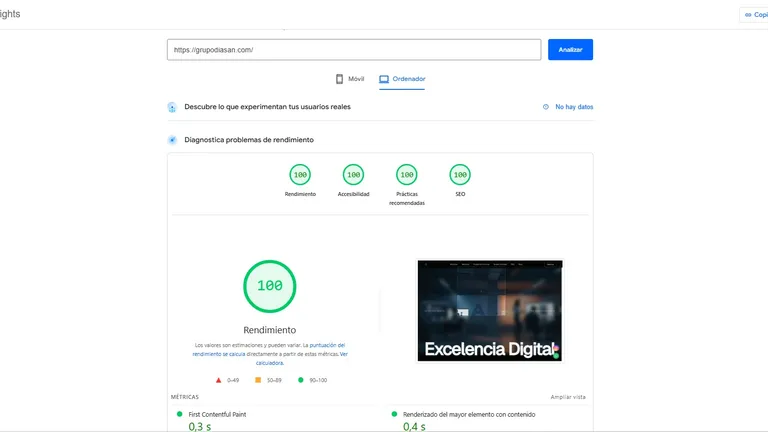 En la parte superior verás dos pestañas independientes. Debajo aparecerán 4 calificaciones: Rendimiento, Accesibilidad, Prácticas recomendadas y SEO, cada una con una puntuación entre 1 y 100.